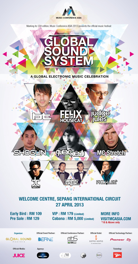 NOTE: Music Conference ASIA 2013 event schedule and Global Sound System set times will be announced prior to the event date. Global Sound System music festival will be held at the Welcome Centre, Sepang International Circuit, Sepang. Conference component will be held on the same date and is free for festival ticket buyer on 'first come, first serve basis' within capacity limit. Details and registration will be announced prior to the event date via official website.